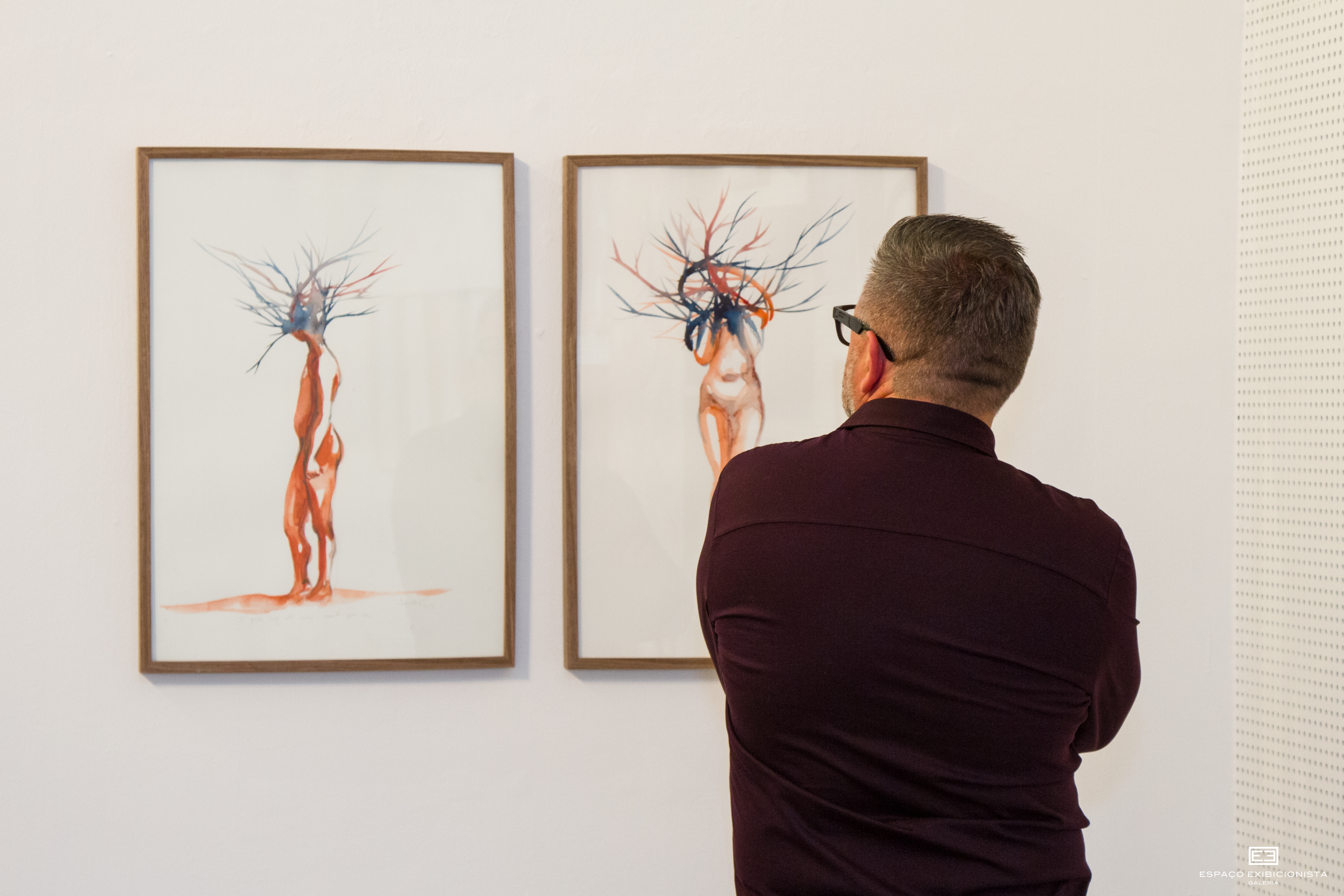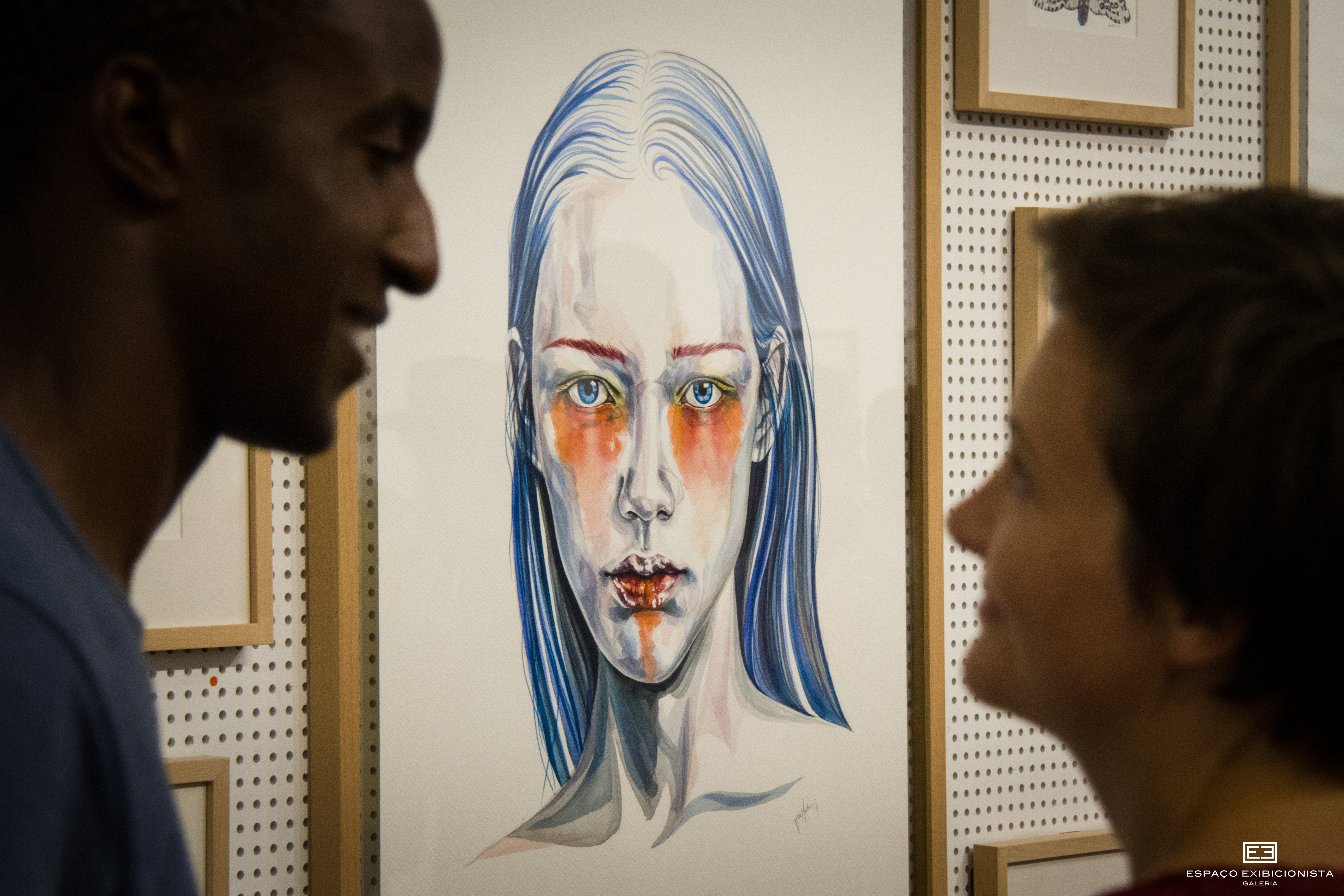 Optei por trabalhar em aguarela e papel de forma mais intensa, mas não foi algo muito pensado. Surgiu lentamente como um exercício técnico e depois expressivo. Foi algo que surgiu de forma natural. Não tenho nenhuma preferência pela aguarela e também não a trabalho da forma considerada como clássica mas fui descobrindo alguns novos encantos nela e a exposição foi sendo construída aos poucos. Retomo também, de forma natural, aos rostos e aos olhares em acrílico por considerar que não conclui este tema ainda e que ainda haverá muito a descobrir.